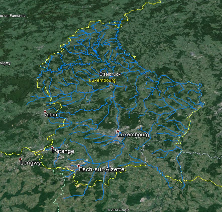 Etant donné l’imbrication très forte du réseau hydrographique grand-ducal dans les pays voisins (France, Allemagne, Belgique), l’application Pegase actuellement utilisée par l’AGELux est basée sur l’application transfrontalière réalisée sur la Moselle. Le réseau complet modélisé reprend 11 040 km de rivières (réseau de 881 rivières) pour 28 400 km² de bassin versant situés dans les districts hydrographiques internationaux du Rhin (Moselle) et, pour une toute petite part, de la Meuse (Chiers). Si on se limite aux masses d’eau du Grand Duché du Luxembourg (2 586 km²), le réseau modélisé reprend 1 260 km pour 153 rivières.