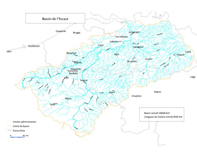 | Description : | A l’initiative de la Vlaamse Milieumaatschappij (VMM, Flandre, Belgique), et avec la collaboration du Service Public de Wallonie (SPW, Belgique) et de l’Agence de l’Eau Artois-Picardie (AEAP, France), une première application de Pegase sur le bassin de l’Escaut (19 320 km²) a été réalisée dans le cadre d’un programme européen LIFE entre 1993 et 1996. Cette première application transnationale tournait avec la version stationnaire de Pegase sur un nombre réduit de rivières (113 rivières pour 3 120 km de rivières simulés). Cette application a été utilisée à plusieurs reprises pour faire des simulations du bassin.